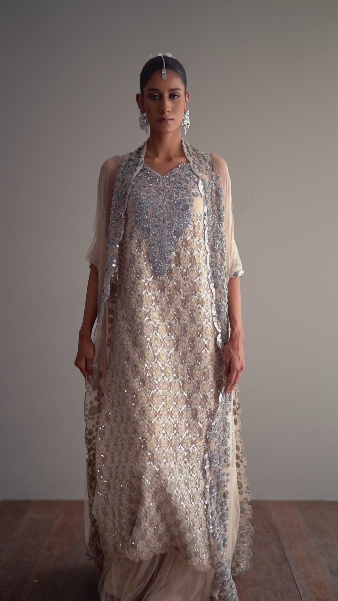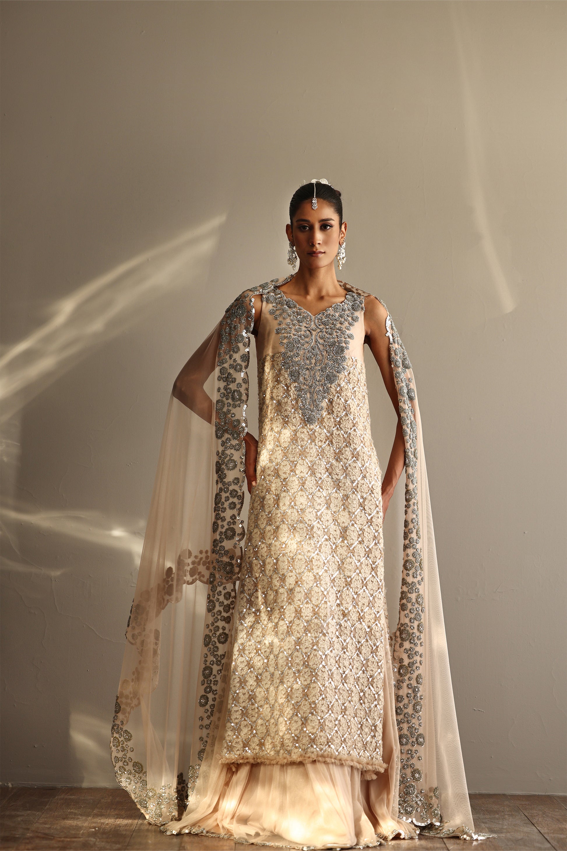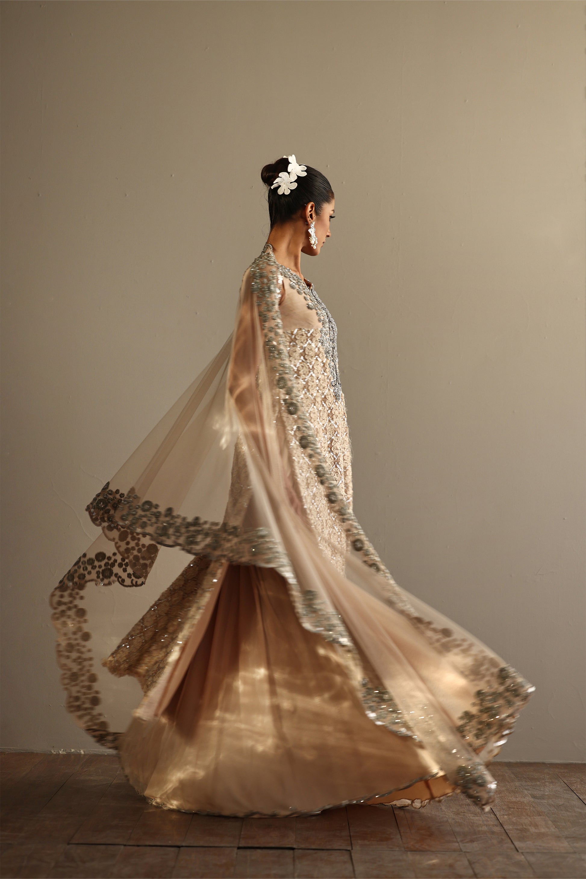 - Includes: Sand colored Tulle, farshi pajama accentuated with sequin border in intricate floral motif. The border also cascading on the 3 yards tulle dupatta.