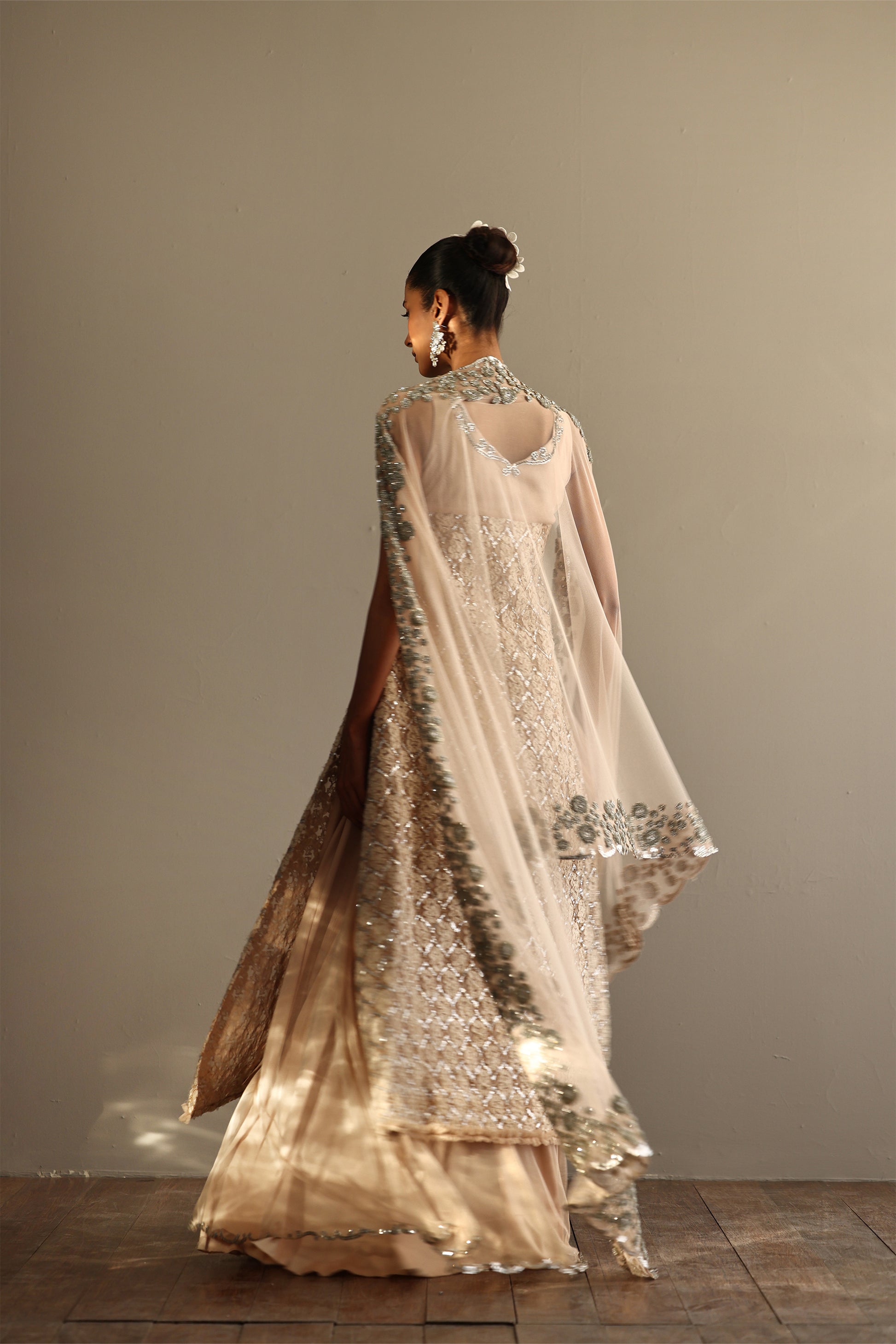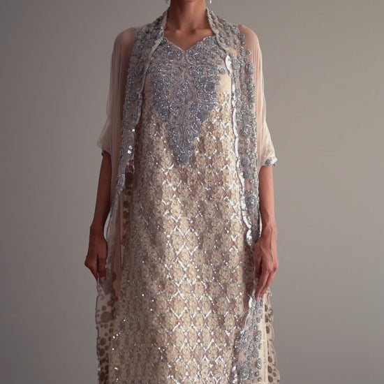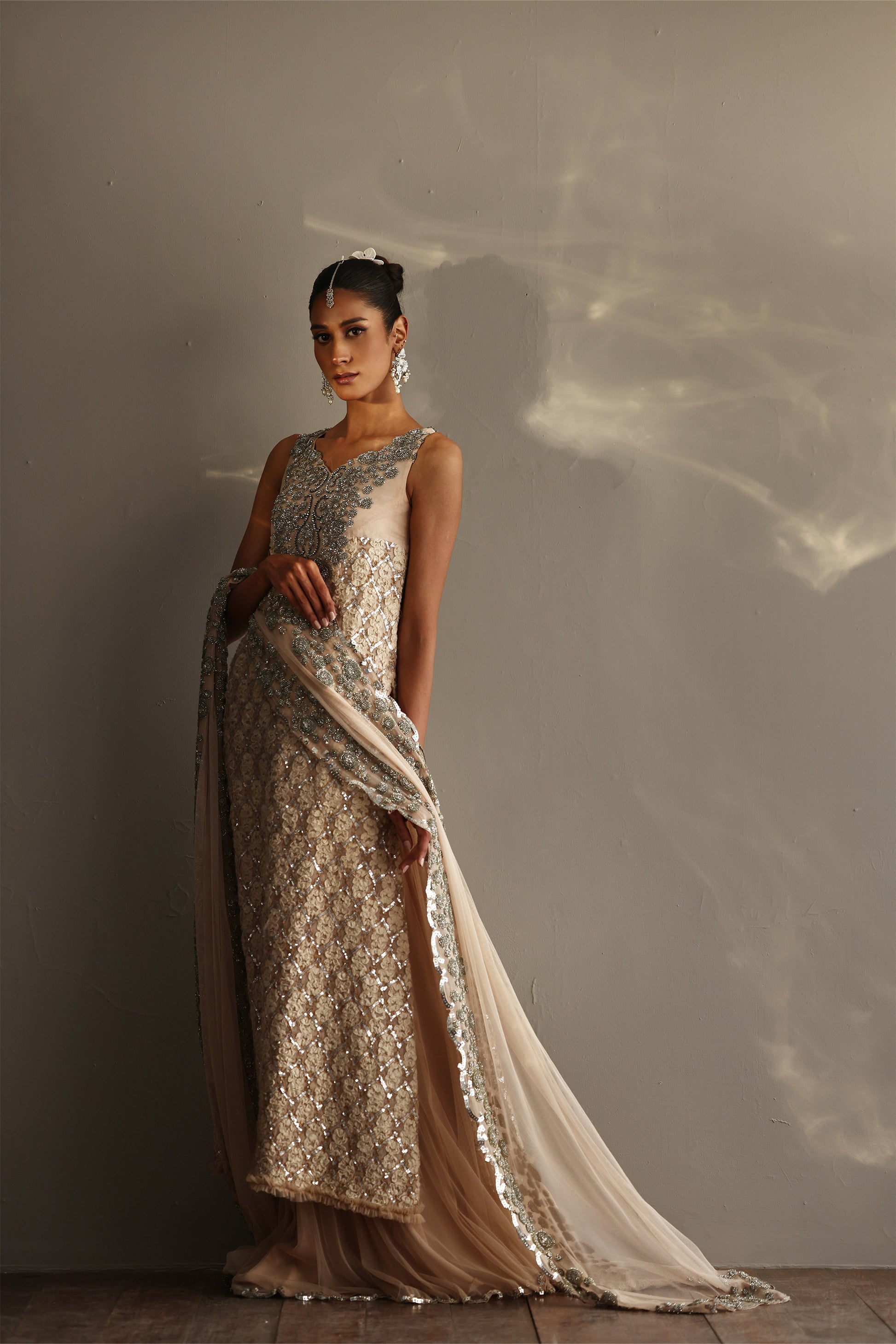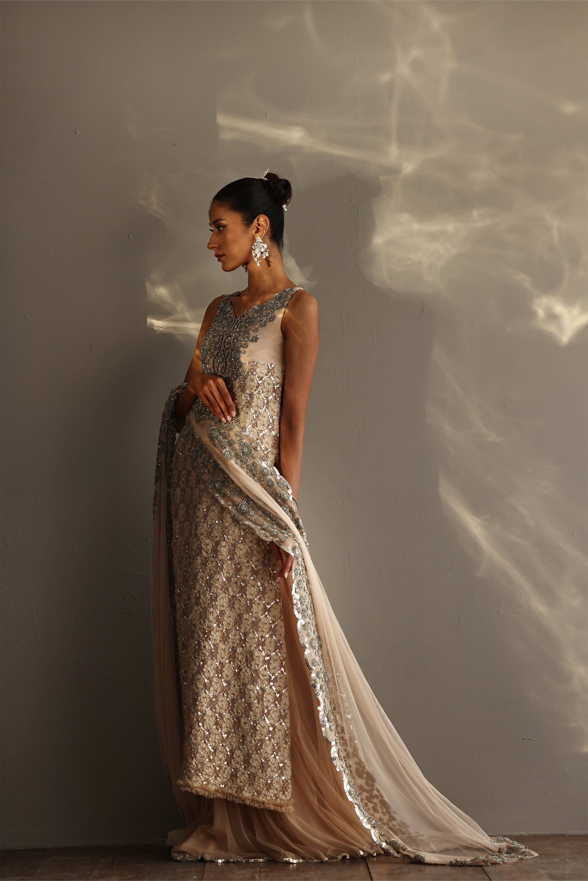 - Includes: Sand colored Tulle, farshi pajama accentuated with sequin border in intricate floral motif. The border also cascading on the 3 yards tulle dupatta.