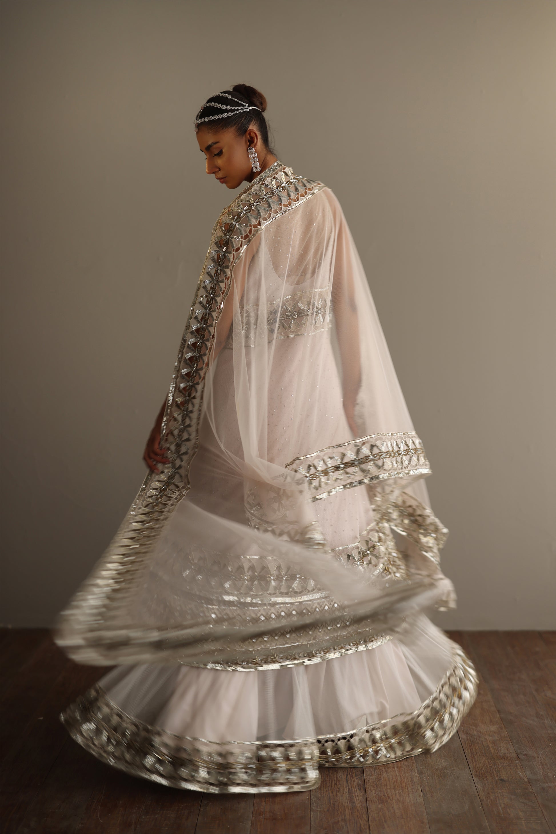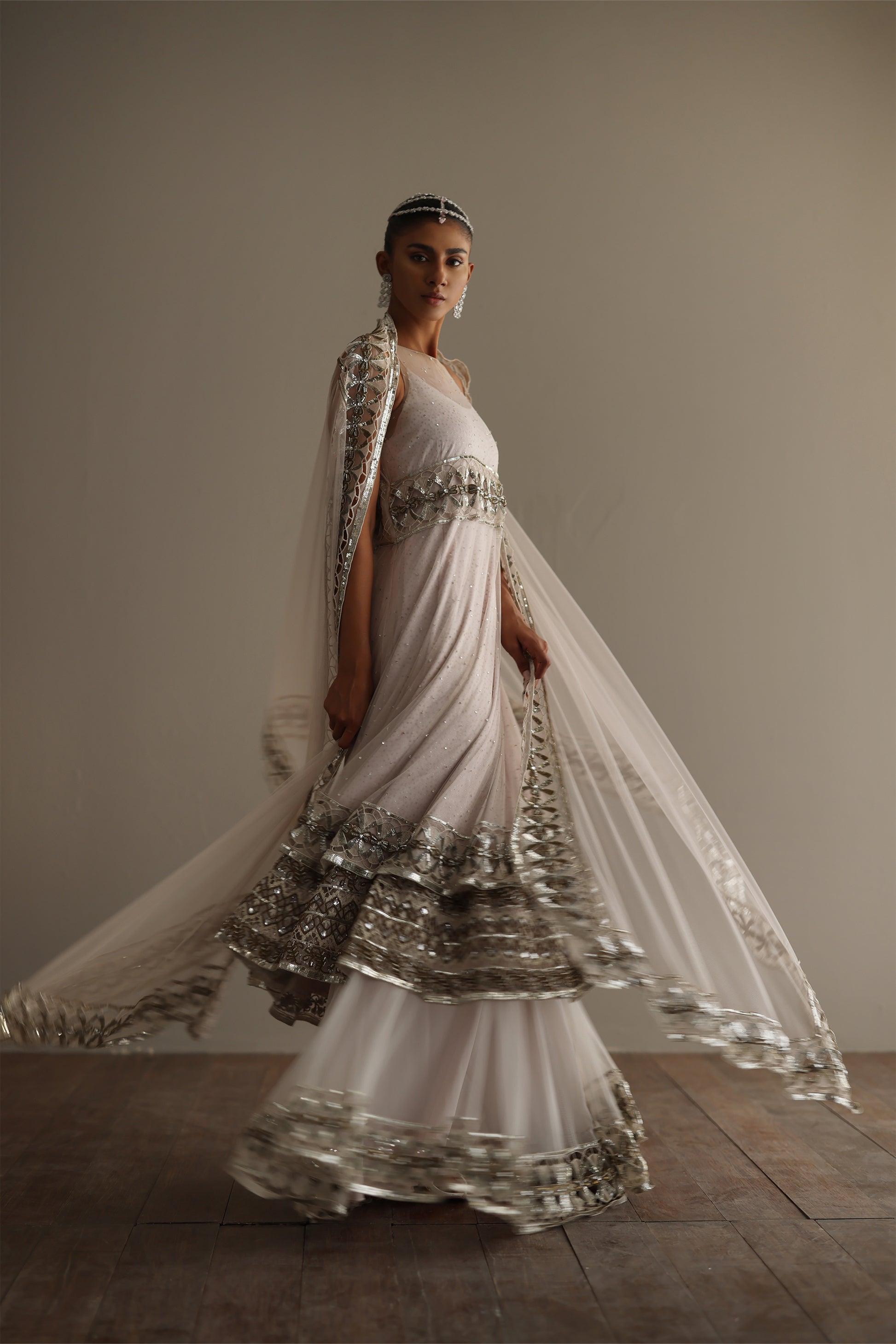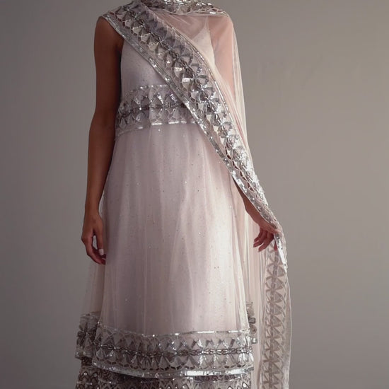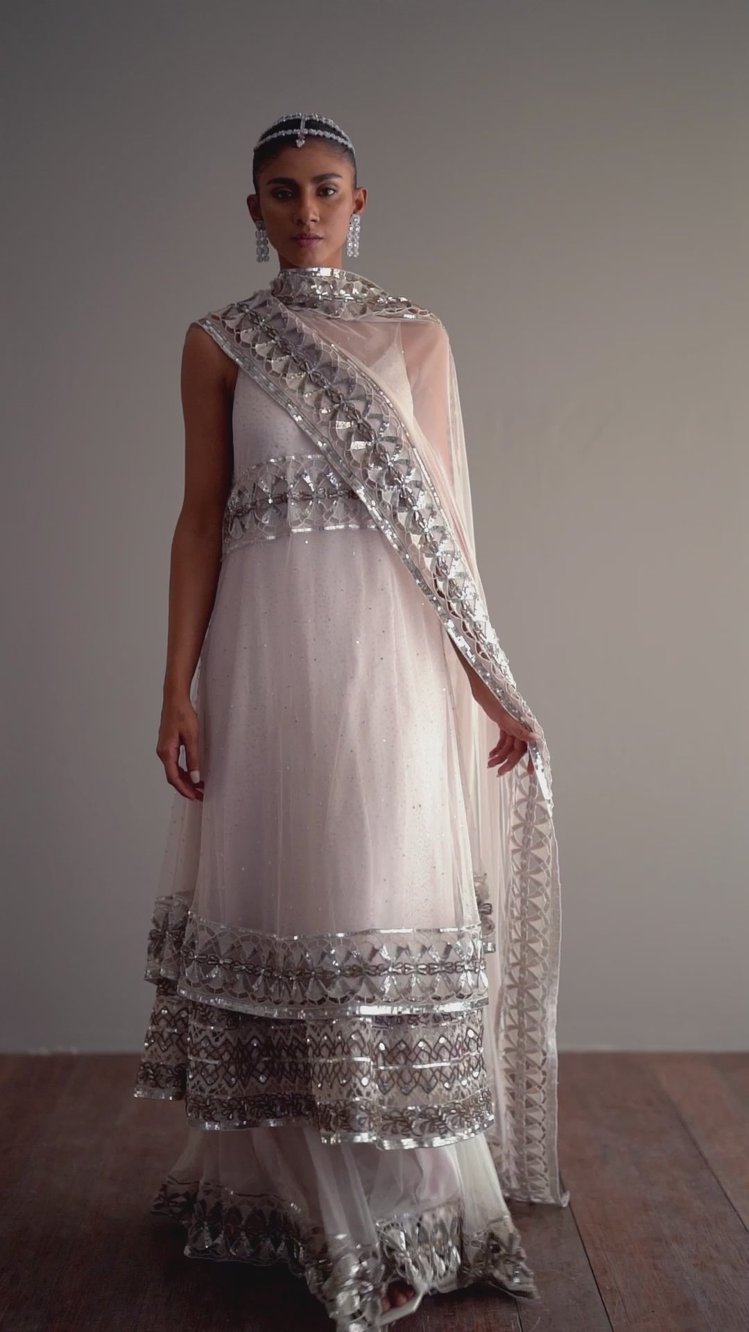 - Ivory tulle ‘Peshwas’, where antique silver thread entwine with zardosi and crystals, each fold revealing transparency, texture and timeless grace.