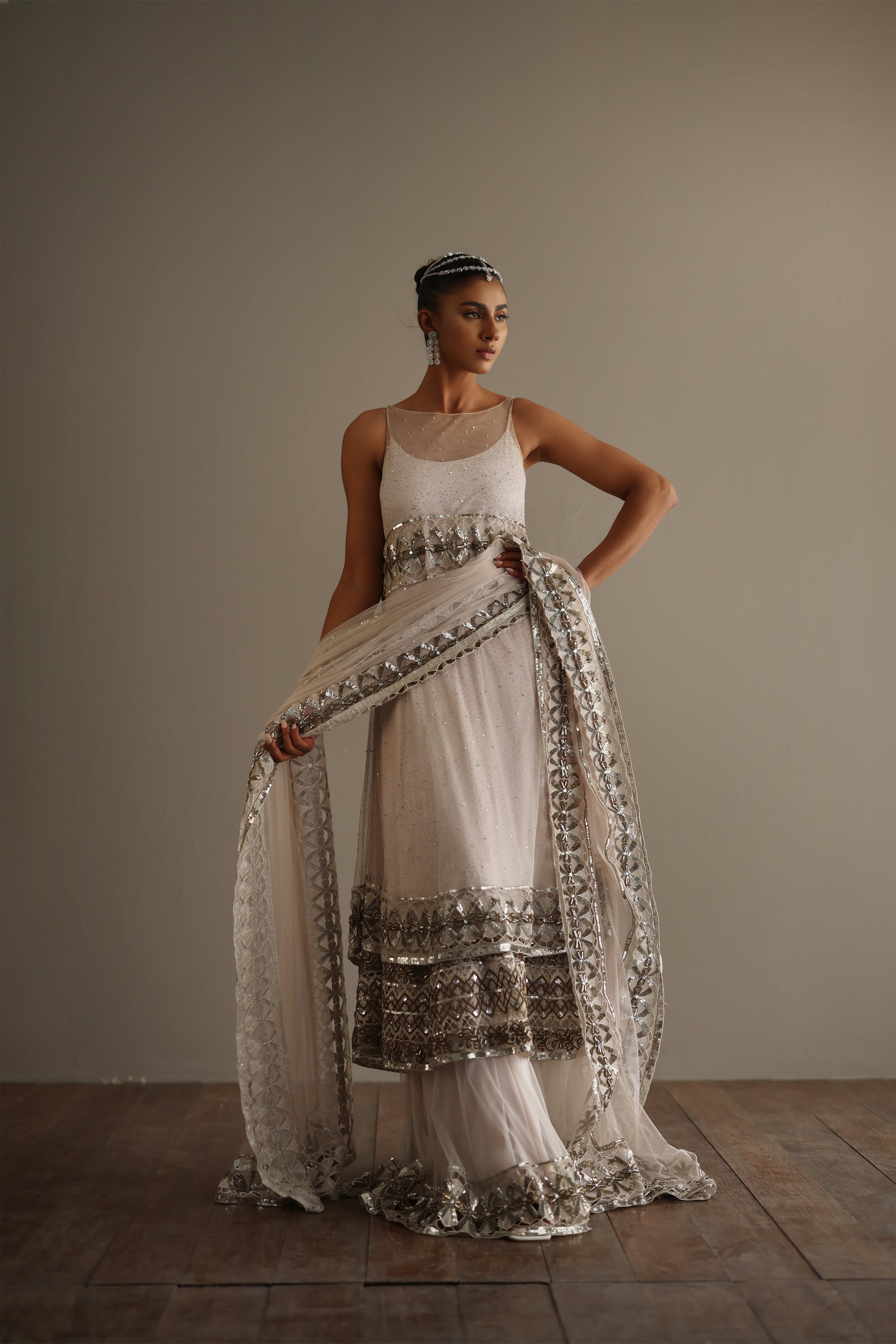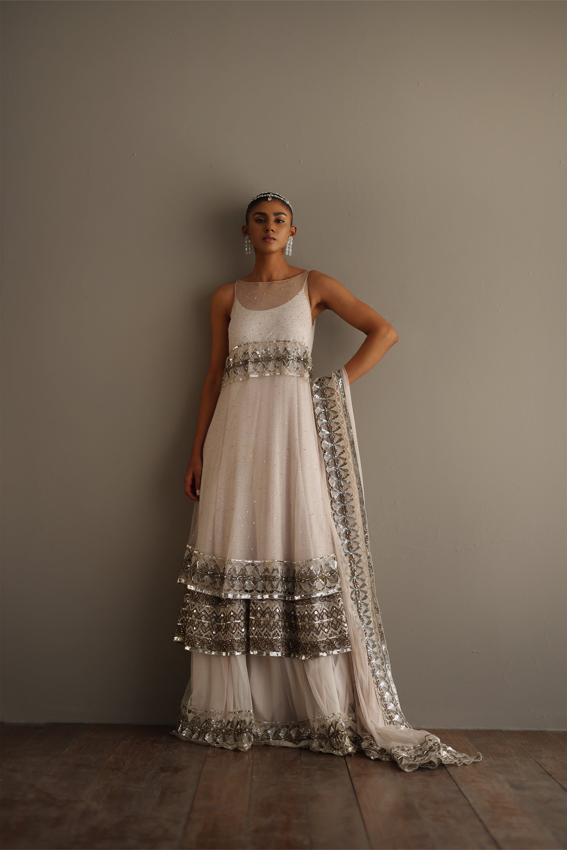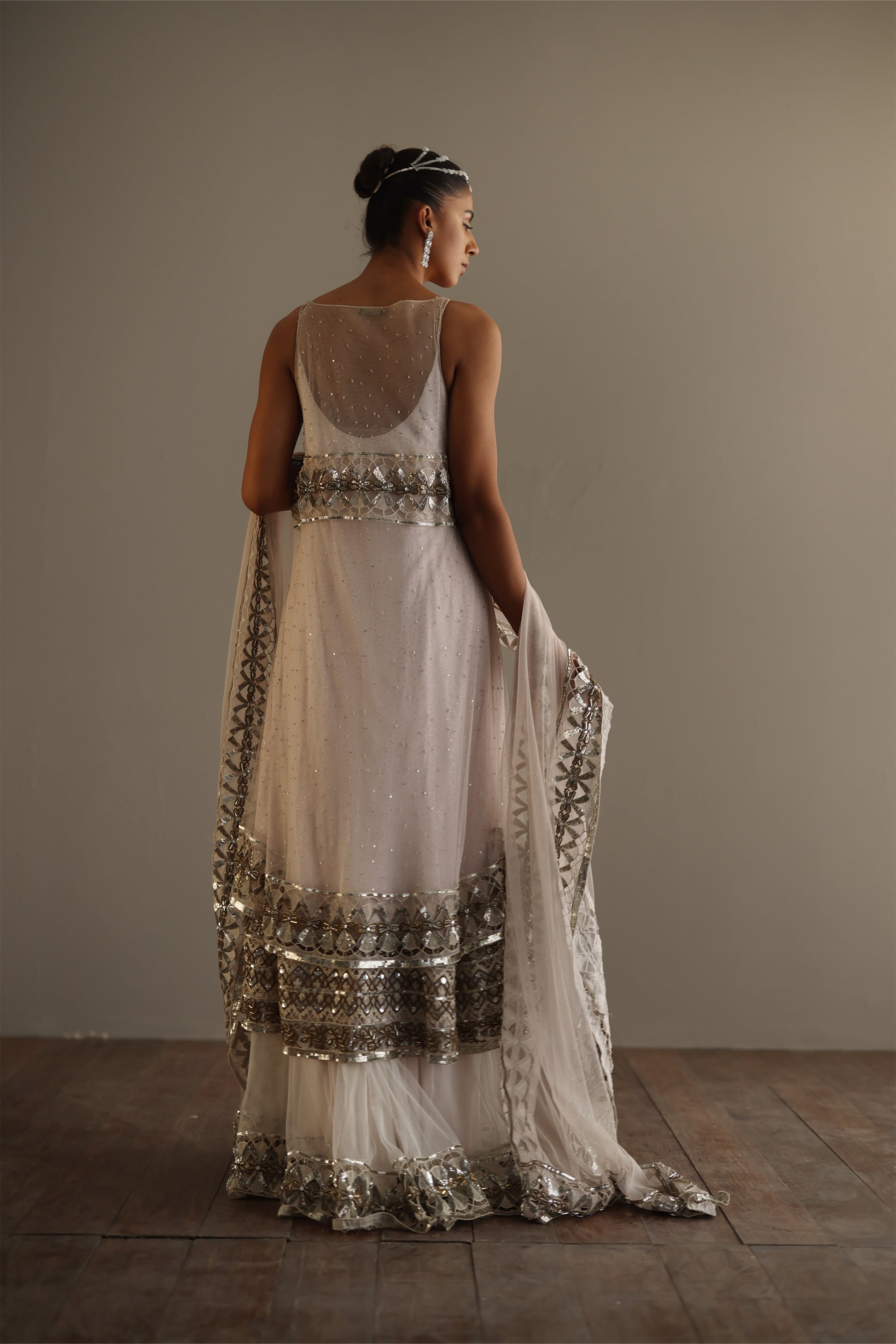 - Ivory tulle ‘Peshwas’, where antique silver thread entwine with zardosi and crystals, each fold revealing transparency, texture and timeless grace.